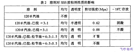 通過以上工作,完成了該膠粘劑的配方分析。確定最后使用配方,SBSl00Phr古馬龍2040Phr、松香40Phr、抗老劑1Phr、促進劑5Phr、增塑荊0.5Phr、混合溶劑740Phr。拉伸剪切強度Mpal.03,無苯類物質檢出,粘度550cp。飛秒檢測認為產品性能優越,同時是無毒,無苯,無污染的綠色環保產品。