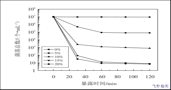 從圖1中可知,不添加抗菌單體,抗菌涂料的細(xì)菌存活數(shù)較高;添加抗菌單體之后,隨著暴露時(shí)間的延長(zhǎng),細(xì)菌存活數(shù)不斷降低;在暴露時(shí)間固定的情況下,抗菌劑用量越多,細(xì)菌存活數(shù)降低,抗菌劑質(zhì)量分?jǐn)?shù)達(dá)到20%時(shí),暴露120 min后,細(xì)菌菌落總數(shù)存活數(shù)低于10 個(gè)/mL,表明抗菌涂料具有良好的抗菌性能。