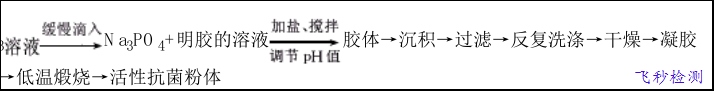 以化學(xué)純的N a 3 P0、AgN 0 3 、Cu(N O ) 3 ) 2 、Zn(N 0 3 ) 2 ,明膠等為主要原料,采用溶膠一凝膠法分別制備出Ag 3 PO4 、Ag 3 PO 4 -Zn 3 (PO 4 ) 2 (Ag-Zn復(fù)合)、Ag 3 PO 4 -Cu 3 (PO 4 ) 2(Ag-Cu復(fù)合)及Ag 3 PO4 -Zn 3 (PO 4 ) 3 -Cu 3 (PO 4 ) 2 (Ag-Zn-Cu復(fù)合)的超細(xì)抗菌粉體。其制備工藝流程如下: