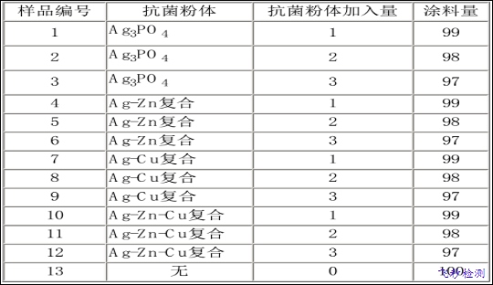 將上述抗菌粉體分別加入丙烯酸涂料中攪拌均勻。抗茵涂料配比見表1,將抗菌涂料分別涂刷到40 m m ×40 m m 水泥塊上,自然干燥后得一組抗菌涂料樣品備用;另一組