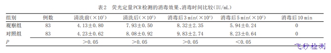 熒光定量 PCR 檢測的消毒效果、消毒時間比較飛秒檢測在消毒后5 min,熒光定量PCR檢測的乙肝病毒脫氧核糖核酸含量為(5.94±0.24)×102 IU / mL,低于對照組的(8.23± 0.64)×102 IU/mL,差異有統計學意義(P<0.05),見表2。