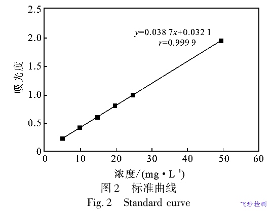 2.線性和范圍的測定 在最大吸收波長232.00nm處測定聚六亞甲基雙胍鹽4.95-49.5mg/L濃度梯度的吸光度值,以聚六亞甲基雙胍鹽酸鹽濃度(X)對吸光度(Y)作圖,如圖2所示,并進行線性回歸,得到方程Y=0.0387X+0.0321r=0.9999,表明聚六亞甲基雙胍鹽在5-50mg/L之間有良好的線性關系。