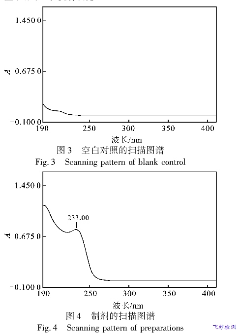 3.專屬性測定 由圖3可知,無任何吸收峰;由圖4可知,制劑圖譜的峰形良好,無雜質峰影響,吸收峰出現在232nm左右,表明輔料對聚六亞甲基雙胍無干擾作用