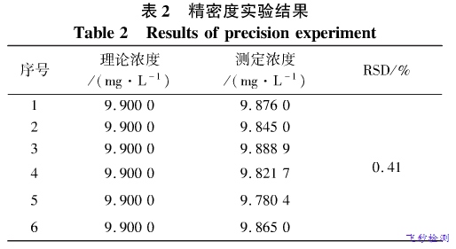 4.精密度測定結果 由表2可知,聚六亞甲基雙胍標準品理論濃度9.9mg/L的溶液,側得濃度平均值為9.8462mg/L,相對標準偏差為0.41%。表明該方法的精密度良好,符合分析要求