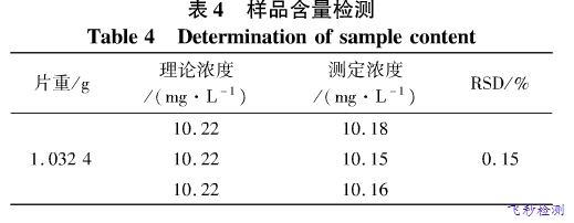 5.樣品測定 按照以上方法對樣品進行檢測,結果表明,用去離子水溶解的樣品,無其他殺菌成分,把樣品稀釋到線性范圍內,所測結果與樣品理論值基本一致,見表4,重復3次測得濃度平均值為10.16mg/L,相對標準偏差為0.15%