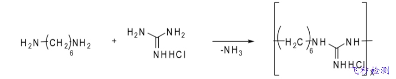 聚六亞甲基胍外觀為白色粉末狀固體,易溶于水,溶于水后為無色至淡黃色液體;其水溶液不燃、不爆、無味,對大多數(shù)金屬材料幾乎無腐蝕作用,使用安全,分解溫度超過400℃,自然環(huán)境中可降解,不會對環(huán)境造成二次污染。自從20 世紀30 年代以來,一系列胍鹽被報道具有較好的殺菌性能,胍鹽衍生物作為殺菌劑和抗霉劑在醫(yī)療、植物保護、工業(yè)和食品等領(lǐng)域得到廣泛應(yīng)用。自20世紀90年代以后,具有高殺菌效力的聚六亞甲基胍被開發(fā)并受到廣泛關(guān)注。聚六亞甲基胍大多通過鹽酸胍與己二胺的縮聚反應(yīng)得到。反應(yīng)方程式如下: