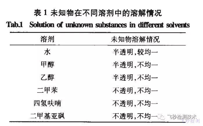 根據光譜解析結果,分別選取了水、甲醇、乙醇、二甲苯、四氫呋喃、二甲基亞砜等溶劑,進行未知物在不同溶劑下的溶解試驗。表1為未知物在不同溶劑