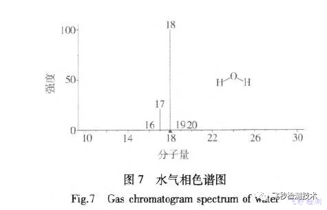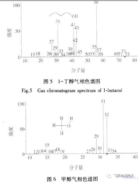 根據氣相色譜一質譜測試結果,圖5一圖7分別為卜丁醇、甲醇和水氣相色譜一質譜圖,可以明顯看到水、1一丁醇(C4H10O)、甲醇(CH4O)的吸收峰,結合前面紅外光譜圖,由此可以斷定未知物中包含卜丁醇、甲基丙烯酸甲酯、苯乙烯、甲醇和水。