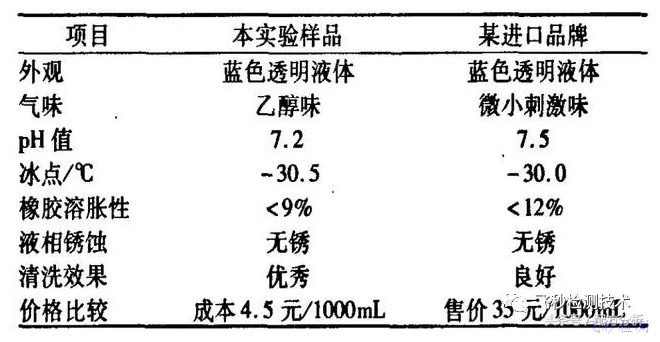 按質(zhì)量分?jǐn)?shù),水60%、乙醇39%、AEO一9 0.3%、LAS 0.2%、其他助機(jī)劑0.5%,混合制得汽車 擋風(fēng)玻璃清洗劑,外觀為藍(lán)色透明液體,乙醇?xì)馕稛o 刺激,pH值接近中性,冰點(diǎn)滿足北方冬季要求,橡膠溶脹性小,液相銹蝕性實(shí)驗(yàn)達(dá)到無銹,清洗效果達(dá)到 優(yōu)秀,主要指標(biāo)優(yōu)于進(jìn)口樣品,并具有成本低廉的優(yōu)點(diǎn)。