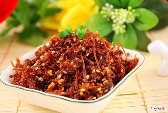 烘烤:托盤上刷一層植物油,以便肉片烤干后脫落,肉片按照紋路橫鋪在托盤上,放入烘房烘烤架最下層,溫度為60-70℃最佳。待烘到水氣消失,肉片由白色變為黑色,又變為棕黃色時將托盤放到架子上層烘烤,共計3-4小時,晾2-3分鐘后,淋香油后即可。