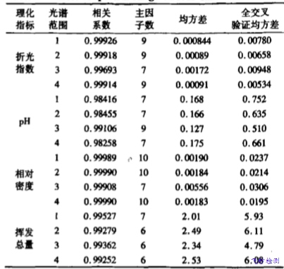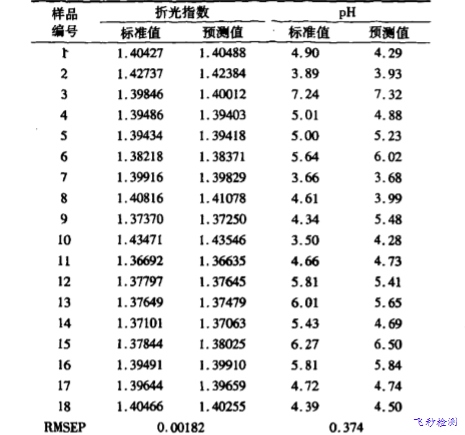 通過不斷地模擬實驗可以總結(jié)出所建模型適用于不同種類的香精與料液,可快速同時對樣品的折光指數(shù)、pH、相對密度及揮發(fā)總量四種理化指標進行預(yù)測,預(yù)測均方差RMSEP分別為0.00182,0.374, 0.00393與3.0