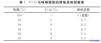 味精與I+G合理搭配可使鮮味倍數呈幾何級上升。試驗中通過“鮮味基數口感測試”得出味精鮮味口 感飽和臨界值(湯料∶味精為 350 mL∶15 g),食用餛 飩時,每 15 g 粉包(鮮味劑占 15%)沖泡成 350 mL 左 右的湯料。為了在降低用量的同時保證鮮度,需要把 鮮味呈味倍數提高到 6~7,通過表 1 計算得到 3 種配 比:2.24 g 味精+0.14 g I+G;2.08 g 味精+0.16 g I+G;1.94 g 味精+0.17g I+G。