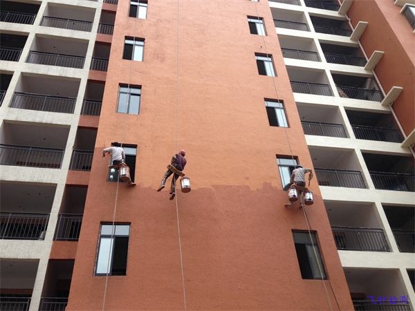 3、主涂層(真石漆)施工:待底涂層完全干燥后(一般需4-6),即可進行施工,根據不同的裝飾要求,先進行試驗噴涂,以確定施工所需的壓力、噴槍口徑及噴涂量,一般5kg/m2。單色主涂層:分兩次噴涂為宜。涂膜未干燥前,即可噴涂第二道。套色主涂層:可選用雙管真石漆噴槍或單管真石漆噴槍分次噴涂。